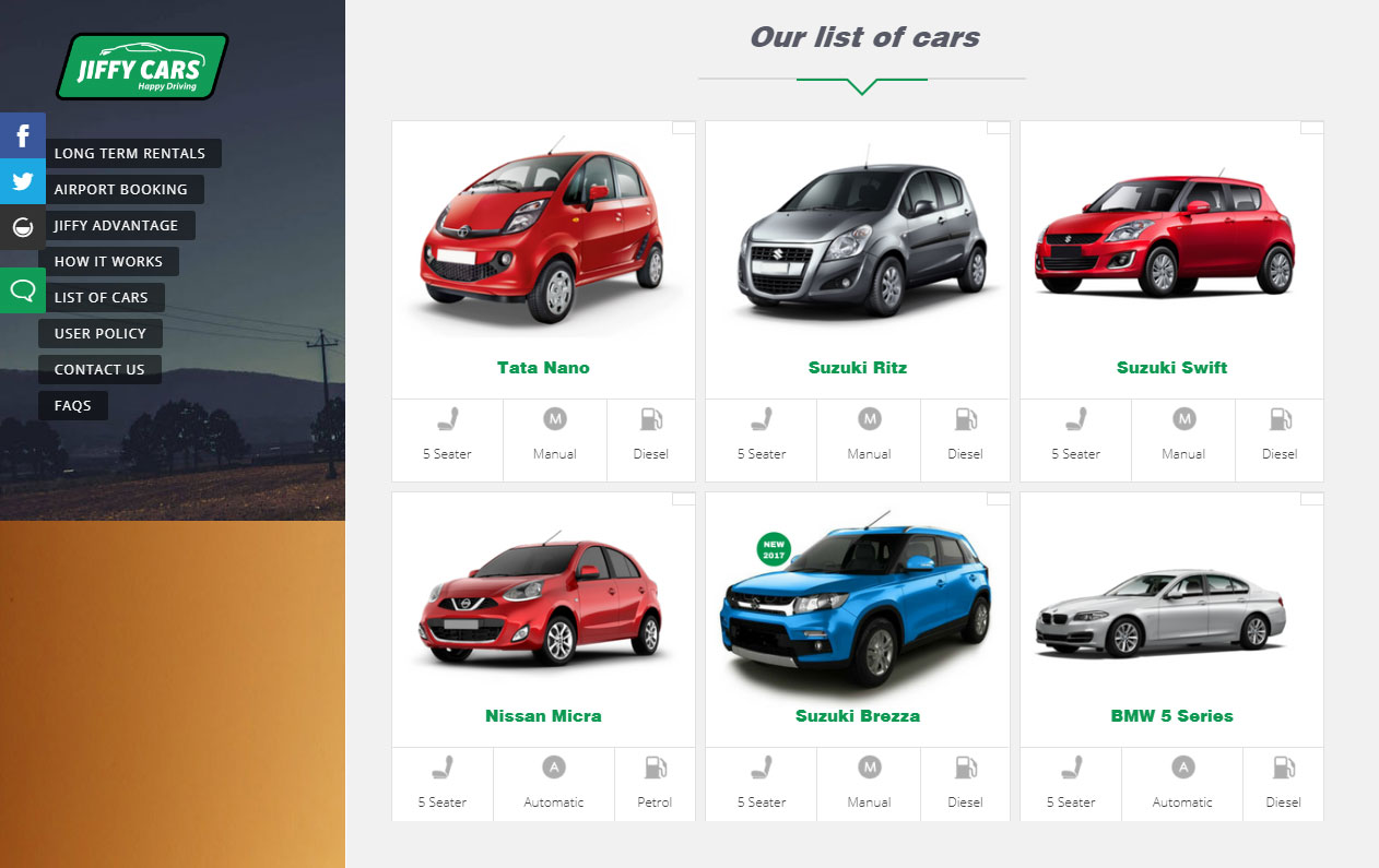 Jiffycars is a tech platform which enables people to book licensed cars for self drive from various parts of India including Bangalore, Cochin, Goa, Hyderabad, Chennai, etc. All cars listed in this platform have a Licensed Permit and come with comprehensive car insurance.